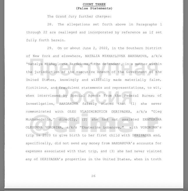 В 2022 году Бардакова прилетела в США 13 мая, чтобы вместе с Ольгой Шрики подготовить все к приезду беременной подруги Дерипаски Екатерины Ворониной, которая вот-вот должна была родить. В 2020 году Бардакова и Шрики уже провернули такую же операцию, так что первый ребенок Ворониной-Дерипаски имеет американское гражданство. Однако в этот раз сотрудники ФБР задержали в аэропорту 2 июня сначала Воронину, а затем и Бардакову. Личную помощницу Дерипаски допрашивали всю ночь, однако она упорно врала, что никогда не общалась с Дерипаской, не бывала в его особняке в Нью-Йорке на 12 Gay Street, не получала от него и не переводила со своих счетов в США деньги по его приказу и т. д. На самом деле она через Шрики и других доверенных лиц закупала в США товары по приказу Дерипаски, передавала от него цветы и подарки — например, их получал американский телеведущий и экс-политик из Канады. Фактически Бардакова в качестве личной помощницы делала все, что приказывал Дерипаска.