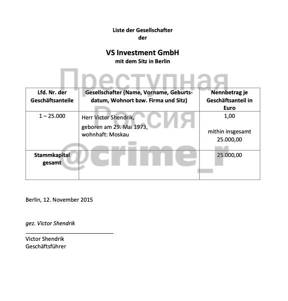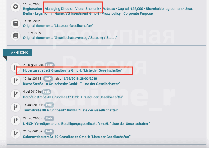 С 2016 года Виктору Шендрику принадлежит компания VS Investment в Берлине — через её счета проходят миллионы евро. Компания владеет долями ещё в нескольких фирмах, на которые записаны крупные объекты недвижимости. Например, Hubertusstraße 2 Grundbesitz GmbH, как следует из названия, управляет своей недвижимостью на Hubertusstraße 2 — по этому адресу расположен лечебно-оздоровительный центр с гостиничной частью Fachklinik & Vitalhotel am Kofel Gesundheitszentrum Oberammergau.
