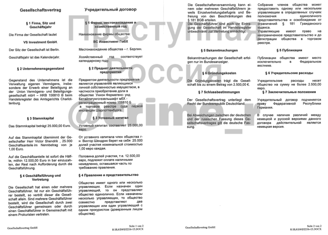 Кроме того, VS Investment Шендрика принадлежала берлинская инвестиционная компания Union Vermögens- und Beteiligungsgesellschaft, которая в 2021 году была влита в UNION Verwaltungsgesellschaft mbH, а та, в свою очередь, была растворена в группе Union Складмана–Шендрика–Тобака.