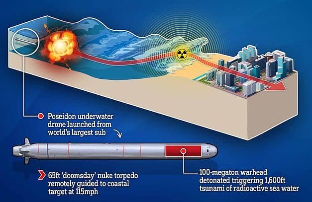 «Посейдон» — беспилотный подводный аппарат с ядерной энергетической установкой. Беспилотник может быть оснащен как обычными, так и ядерными боеприпасами. ТАСС со ссылкой на источники сообщал, что «Посейдон» будет способен нести ядерную боевую часть мощностью до двух мегатонн, а его максимальная скорость хода составит 200 километров в час. Военно-морской флот России получит до 32 аппаратов «Посейдон», которые планируют разместить на четырех подлодках.