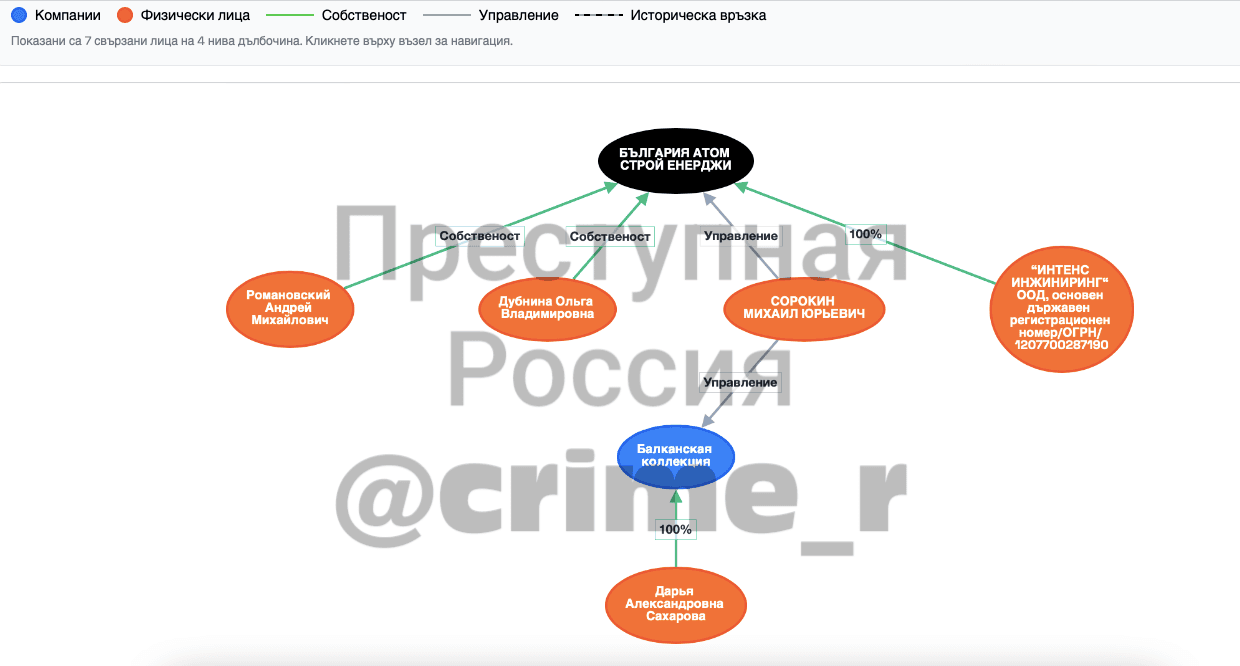 Сейчас директором болгарской компании выступает совладелец российской «Интэнс инжиниринг» Андрей Романовский, который отстёгивал деньги Сахарову. Именно российскому «Интэнс инжинирингу» принадлежит фирма «БЪЛГАРИЯ АТОМ СТРОЙ ЕНЕРДЖИ», а совладельцами являются Романовский и Ольга Дубинина — пермская подруга жены Геннадия Сахарова Дарьи Маркиной. Кроме того, у «Болгария Атом Строй Энерджи» есть филиал в Москве, директором которого является Валерий Борко. В Тверской области семейству Борко принадлежит строительная компания «Спецвысотэнергострой», у которой есть филиалы в разных регионах страны — в частности, в Курчатове Курской области и Волгодонске Ростовской области. Интересно, что работы фирмы Борко в Волгодонске были тесно связаны с ФГУП ОАО «НИАЭП» — именно у этой дочки «Росатома» суд в 2012 году запрашивал данные о доверенности, которую Борко выдавал директору своего филиала. Руководил «НИАЭП» тогда всё тот же Валерий Лимаренко.