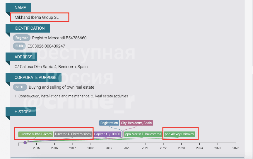 Всего по обвинению в отмывании денег «русской мафии» в конце 2020 года Испания задержала 23 человека, а в ходе обысков изъяла оружие, деньги, драгоценности, арестовала криптовалютные кошельки и 16 машин класса «люкс». Преступники отмывали деньги через недвижимость, ночные клубы и рестораны. Руководил группировкой, по данным полиции, Алексей Широков — адвокат и бизнесмен, которому принадлежало несколько фирм в Испании, в том числе занимающаяся недвижимостью MIKHAND IBERIA GROUP SL. Соучредителями этой компании были два советника гендиректора «Росатома» — Михаил Ухов и Андрей Черемисинов (внезапно скончался в октябре 2024 года). Ухов до сих пор является её директором. В России у Ухова также остался действующий бизнес — фирма «Ортус», и, конечно, прописана она в Нижегородской области. Там же у советника главы «Росатома» были также строительные компании ООО «СЗ Гребешок» и ООО «Кельма».