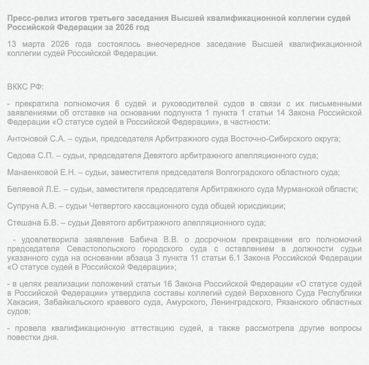 Председатель Девятого арбитражного апелляционного суда Сергей Седов и судья того же суда Борис Стешан лишились статуса, решением Высшей квалификационной коллегии судей Российской Федерации, рассказали источники, знакомый ситуацией. Они подали письменное заявление об отставке в соответствии с подп. 1 п. 1 ст. 14 закона о статусе судей, уточняют источники.