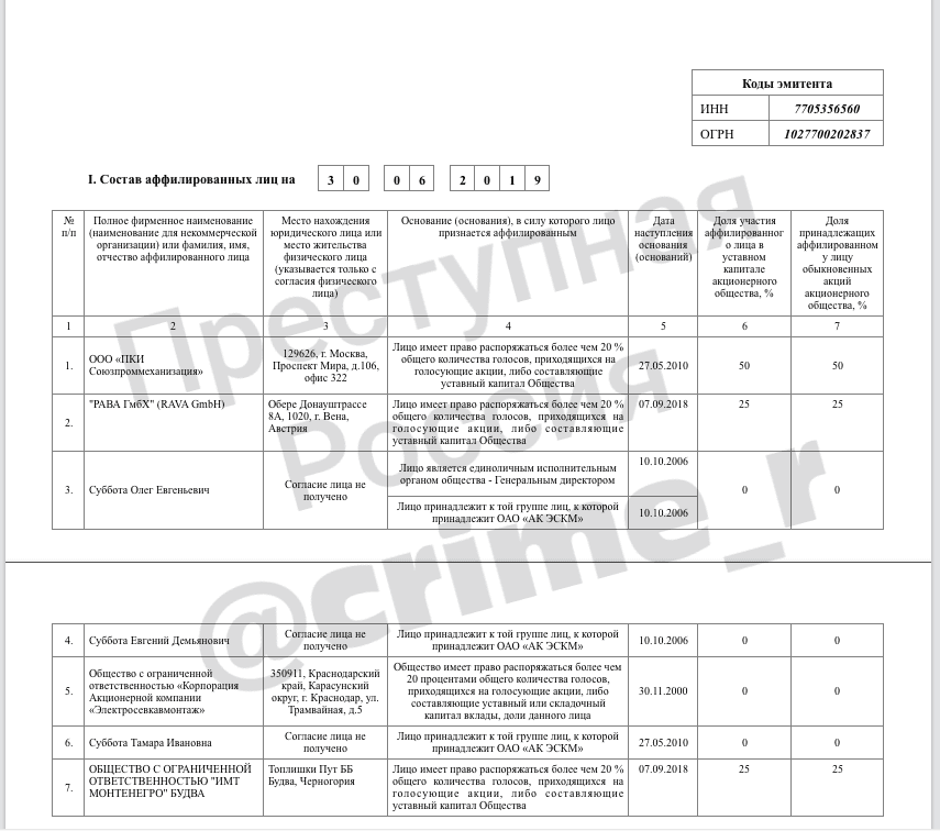 Так, по 25% в ОАО «АК “Электросевкавмонтаж”» принадлежит австрийской RAVA GmbH и IMT Montenegro Budva (Черногория). RAVA GmbH использовали при выводе средств из ПАО «ЯТЭК» её генеральный директор Рубен Геворкян, его многочисленные родственники и связанные с ними лица.