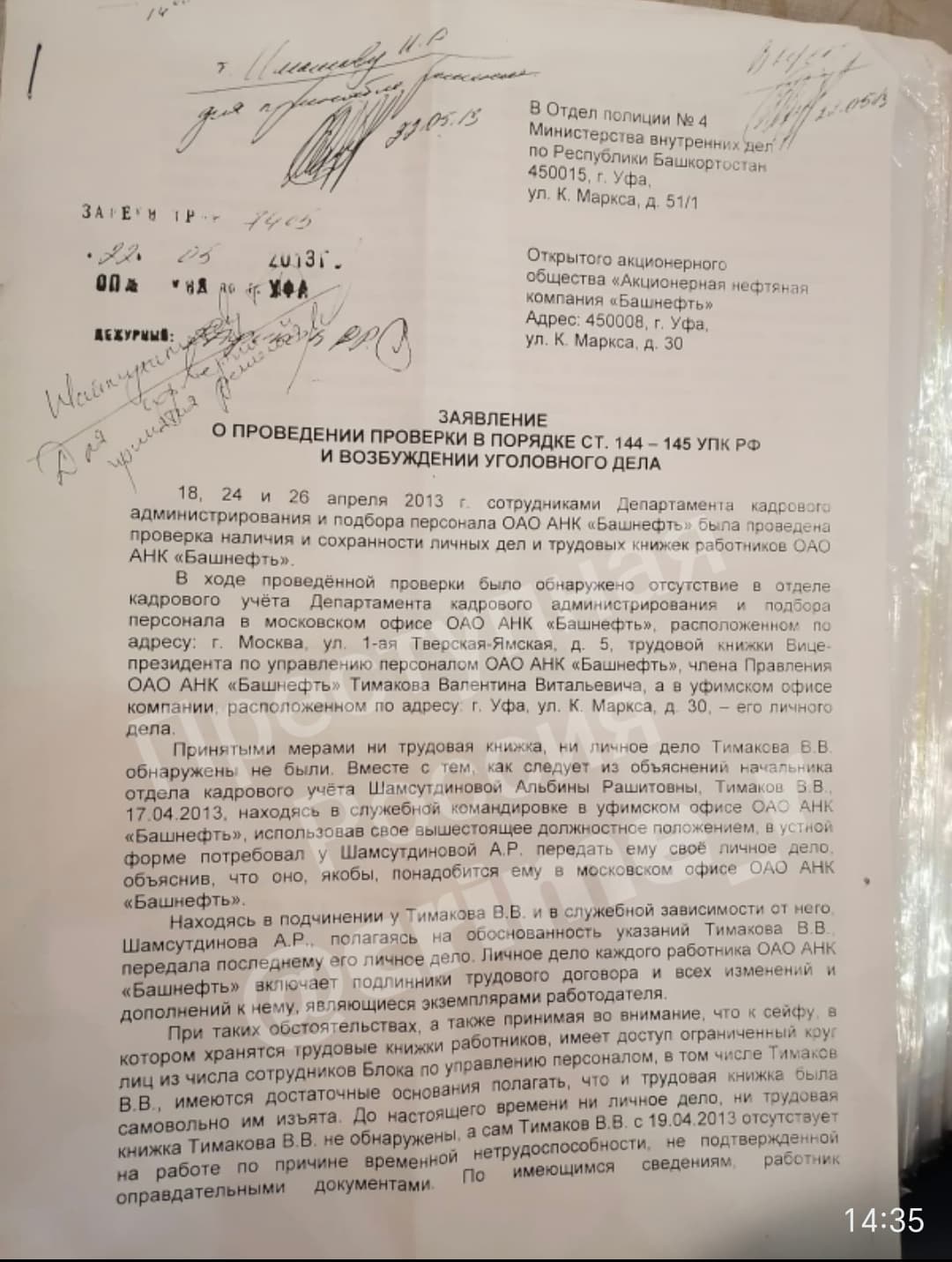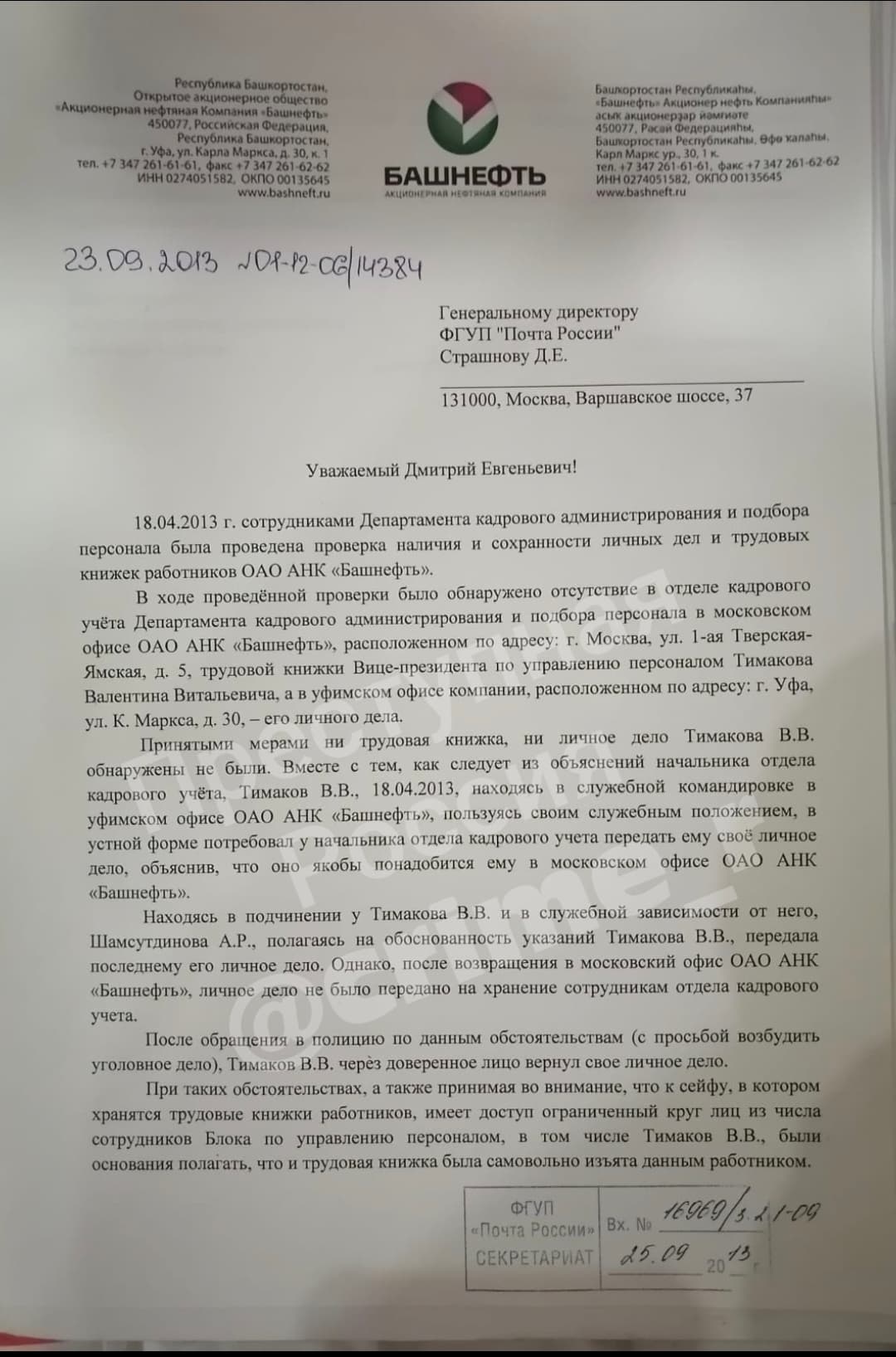 Сотрудники «Башнефти» обратились в правоохранительные органы с заявлением о пропаже важных документов и просьбой провести проверку в рамках статей 144–145 Уголовно-процессуального кодекса РФ. Одновременно Тимаков подал иск против компании, оспаривая правомерность действий работодателя.
