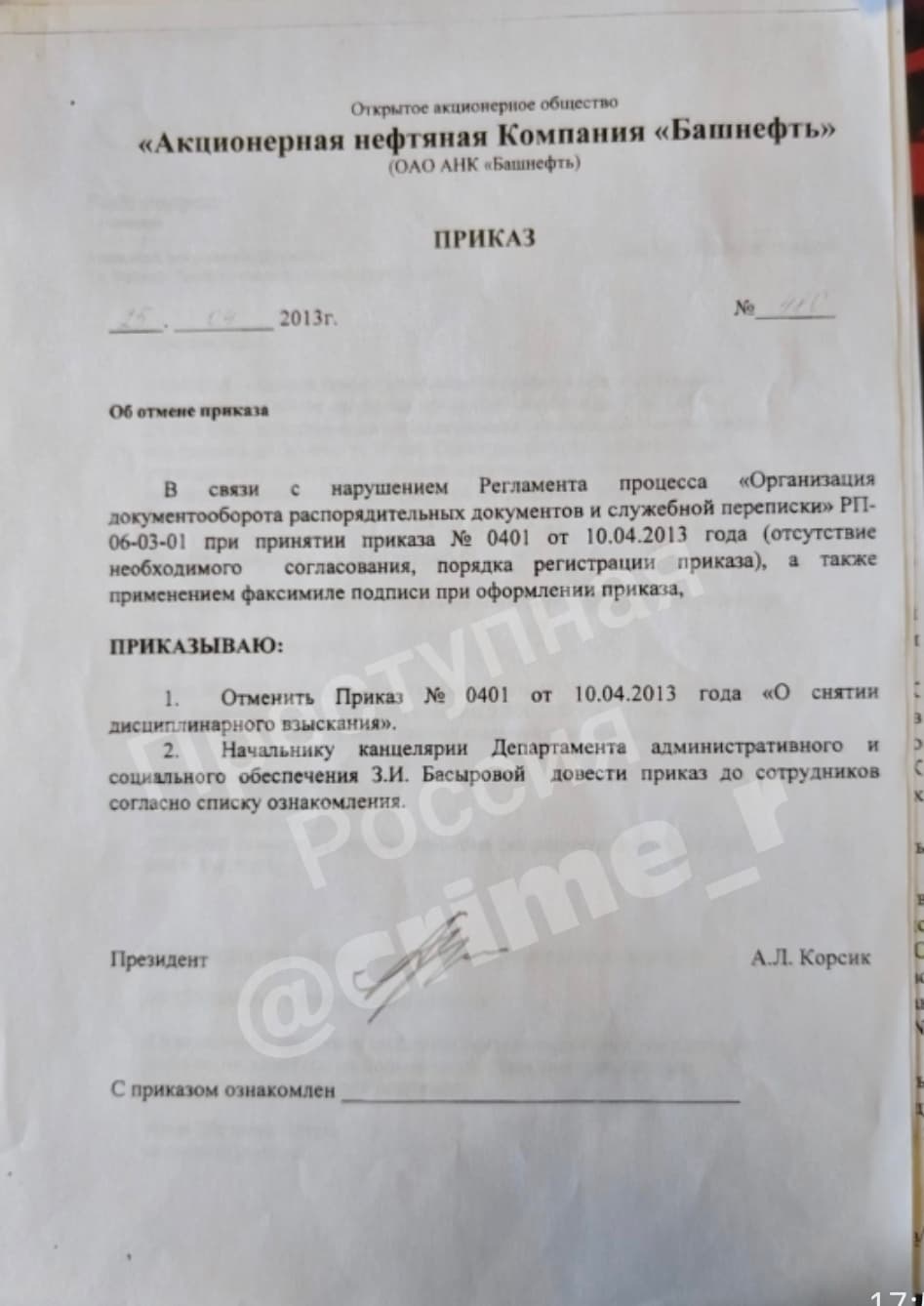 Учитывая то, что он и его близкая подруга Угургел (она же Перескокова) занимали в компании руководящие должности и у них был доступ к оригиналам всех документов сотрудников, в том числе к факсимиле президента компании Корсика, Тимаков сам напечатал приказ № 0401 от имени президента «Башнефти» о снятии дисциплинарного взыскания в виде выговора.