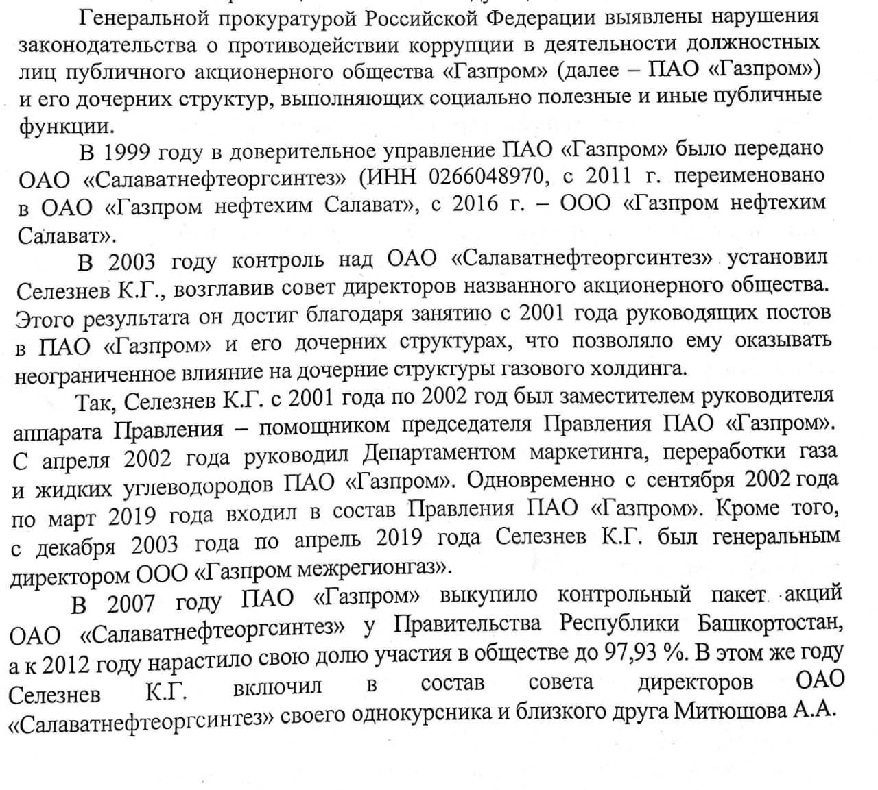 Заместитель Генерального прокурора РФ подаёт иск во Фрунзенский районный суд Санкт-Петербурга. В документе говорится о незаконном выводе активов на сумму свыше 150 млрд рублей. Ответчиками названы бывшие топ-менеджеры «Газпрома», а также десятки компаний и инвестиционных фондов, через которые, по версии прокуратуры, шёл вывод средств из «Газпром нефтехим Салавата».
