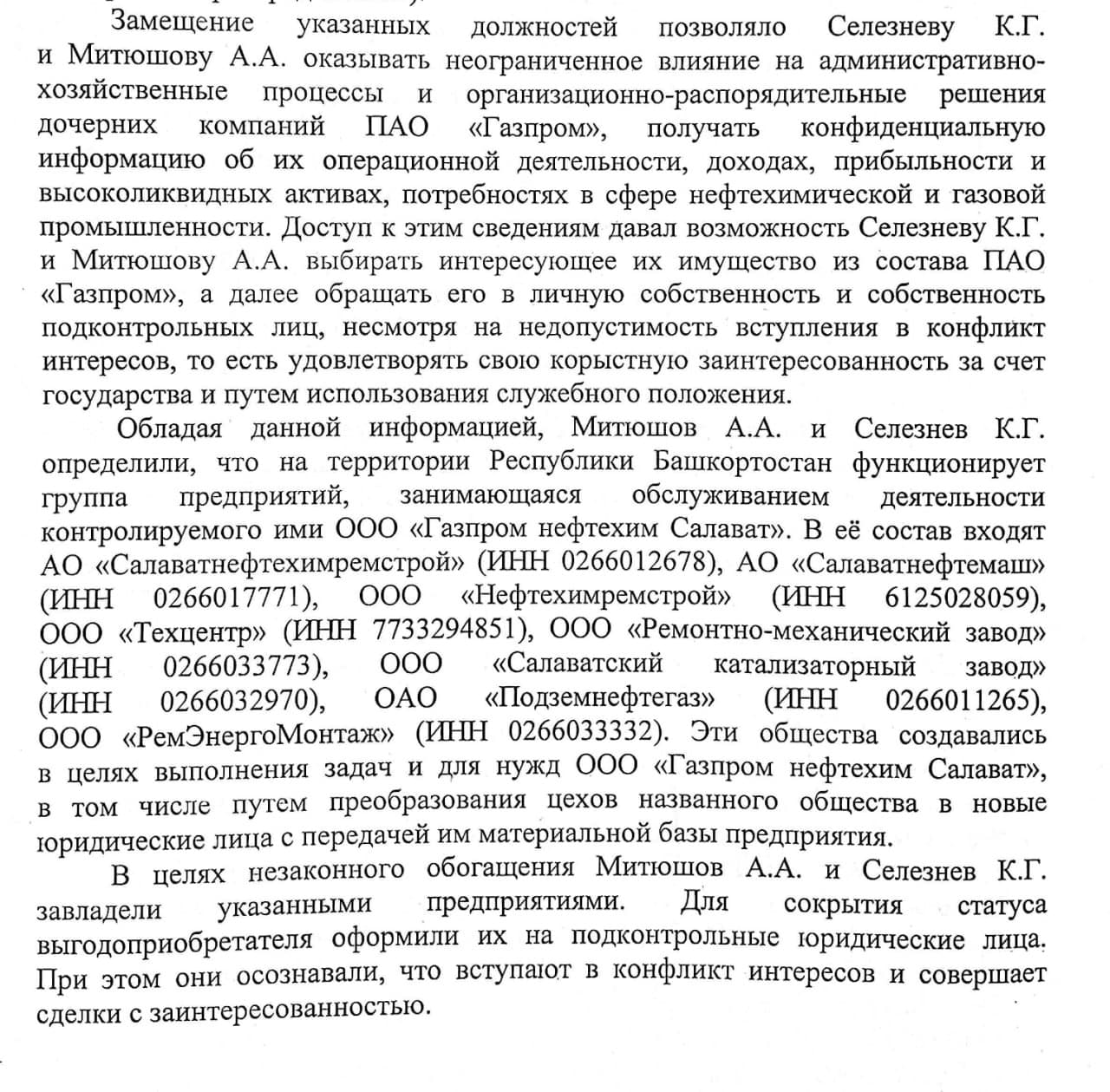 Именно в это время, по версии прокуратуры, Селезнёв и его соратники — Алексей Митюшов, Елена Михайлова и другие руководители среднего звена — начали выстраивать сеть подрядных компаний, через которые финансовые потоки «Газпрома» и «Газпром нефтехим Салавата» перенаправлялись в частные структуры. В судебных документах описаны многолетние схемы фиктивных перевозок, завышенных тендеров и подставных подрядчиков, в результате которых из периметра госкорпорации было выведено не менее 200 миллиардов рублей.