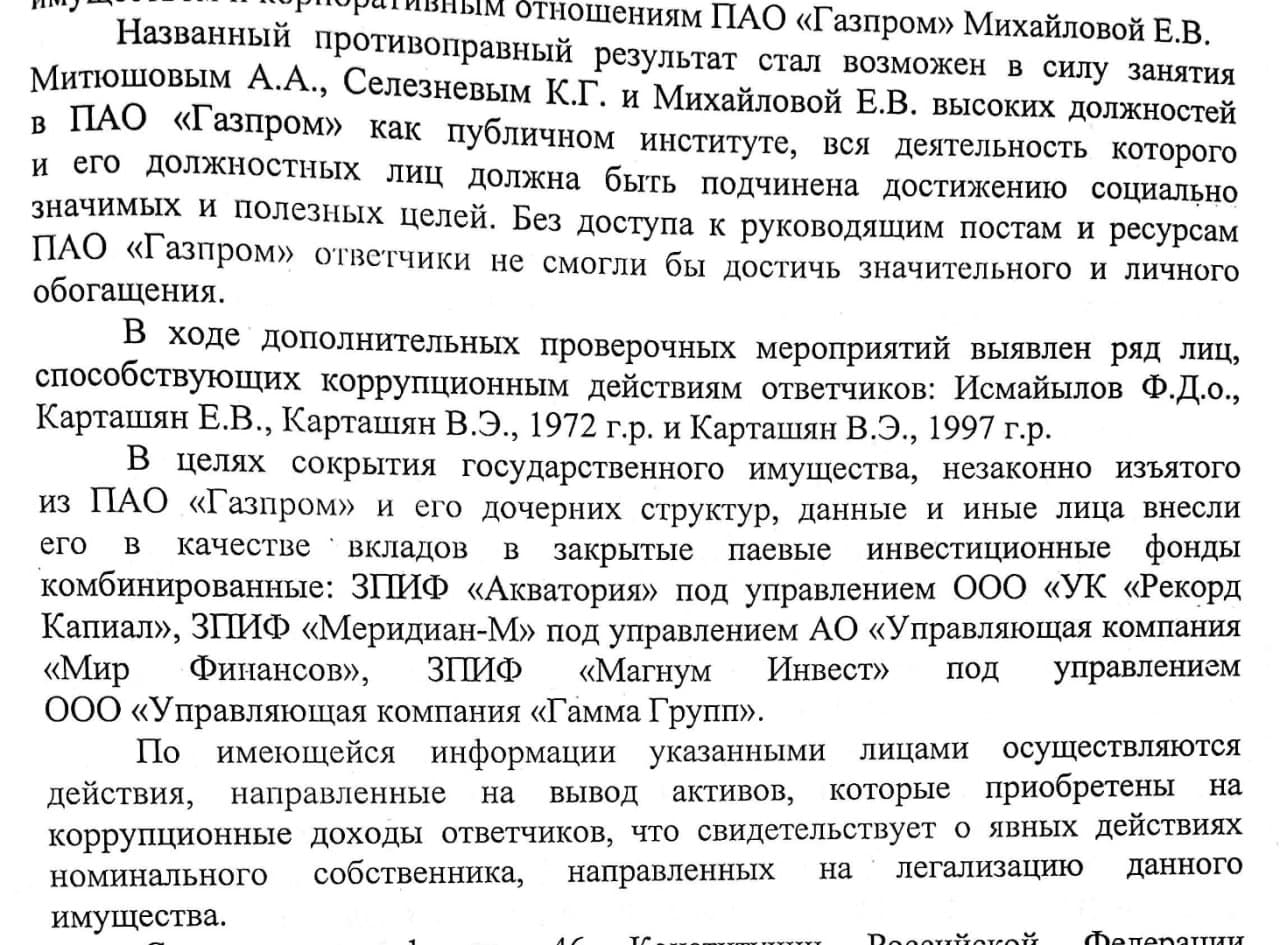В свою очередь Елена Михайлова с 2011 по 2024 годы была ближайшей соратницей Селезнева и занимала руководящие позиции в департаменте имущественного управления ПАО «Газпром». В определении Фрунзенского райсуда прямо указано, что именно её подписи стояли под решениями, позволявшими одобрять сделки с заинтересованностью и перевод активов между дочерними обществами концерна.